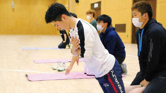 学内の講義を基礎として、スポーツ障害予防のプログラムを立案し、実行することにより、幅広い知識と指導力を身につけます。