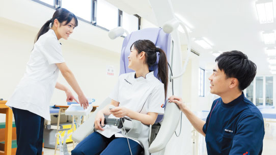 温熱療法・光線療法・水治療法・電気刺激療法・牽引療法・マッサージ療法(浮腫軽減)など各種物理療法について、理論や実習を通して学びます。基本的な知識・技術を確実に習得しながら、最新の機器を使用した新しい治療法を身につけます。
